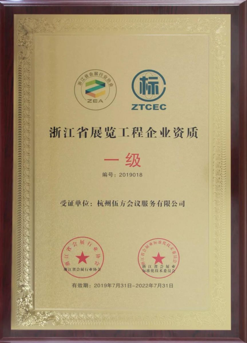 伍方資訊丨恭喜伍方通過(guò)評(píng)審成功獲得浙江省展覽工程企業(yè)資質(zhì)一級(jí)證書(shū)