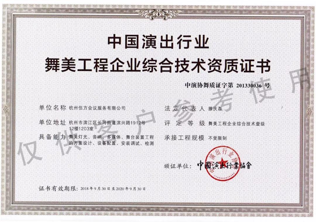 (中國(guó)演出行業(yè)舞美工程企業(yè)綜合技術(shù)資質(zhì)證書(shū),評(píng)定等級(jí)為舞美工程企業(yè)綜合技術(shù)壹級(jí))