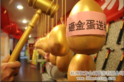 定制金蛋時(shí)事先放入需要的獎(jiǎng)項(xiàng),將其吊在空中,然后每人選擇一個(gè)金蛋砸碎,幸運(yùn)者中獎(jiǎng)。